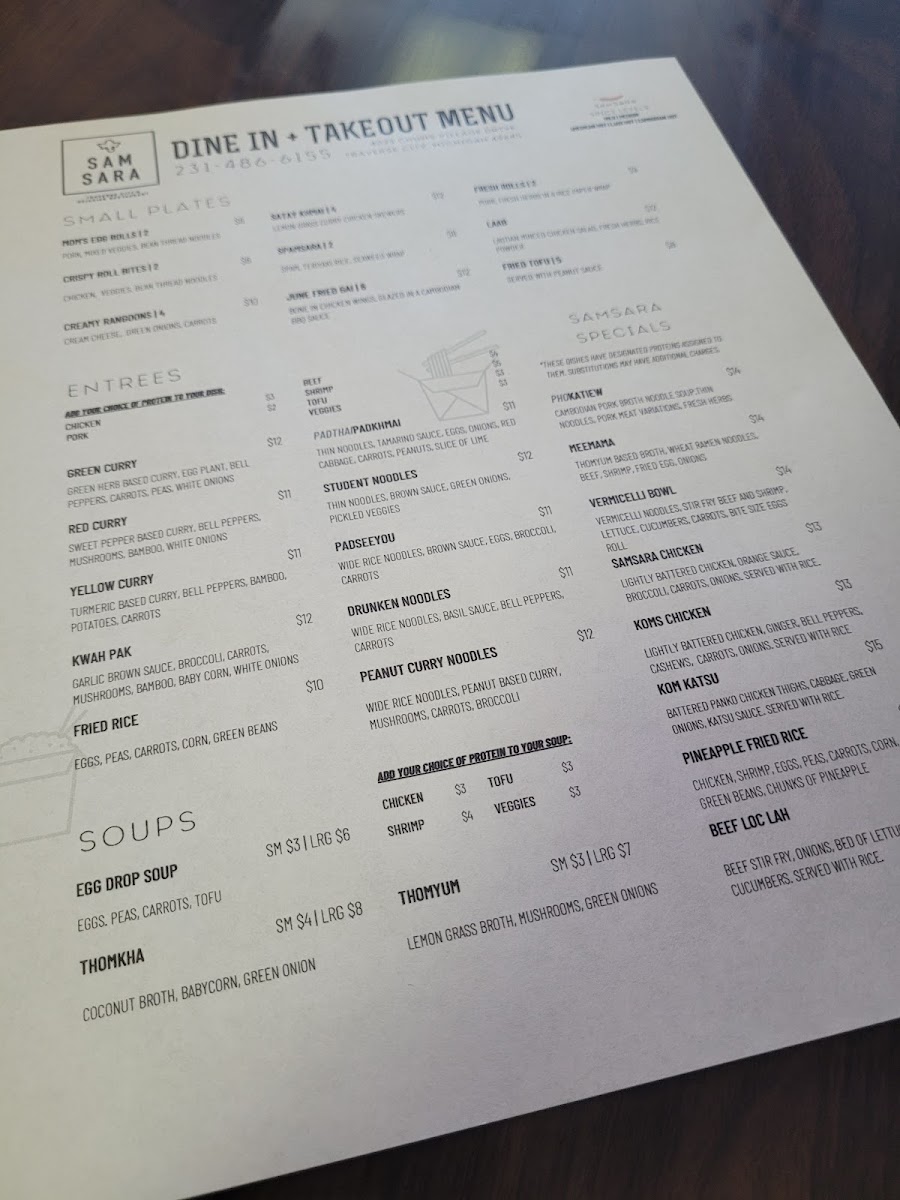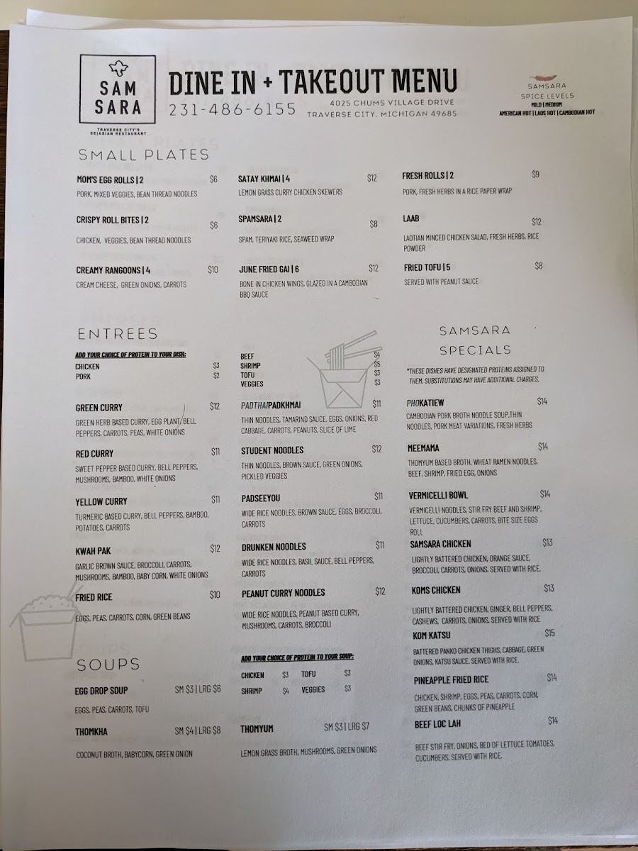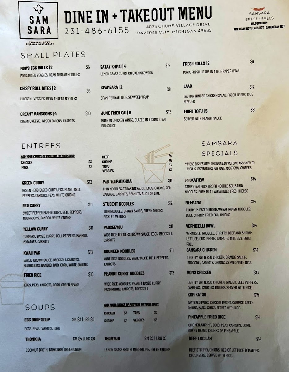 Samsara Southeast Asian Cuisine brings the vibrant flavors of Thailand, Vietnam, and neighboring regions to Traverse City with a menu that celebrates balance, freshness, and aromatic spices. The restaurant offers a diverse selection of Southeast Asian favorites including noodle dishes, fragrant curries, rice plates, fresh salads, and savory appetizers. Guests can complement their meals with specialty teas, refreshing beverages, and traditional drinks that highlight the bright, herbal character of the cuisine.