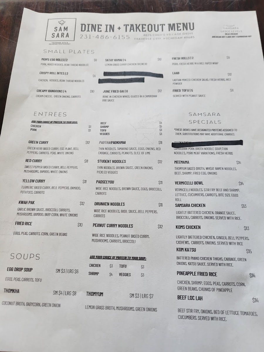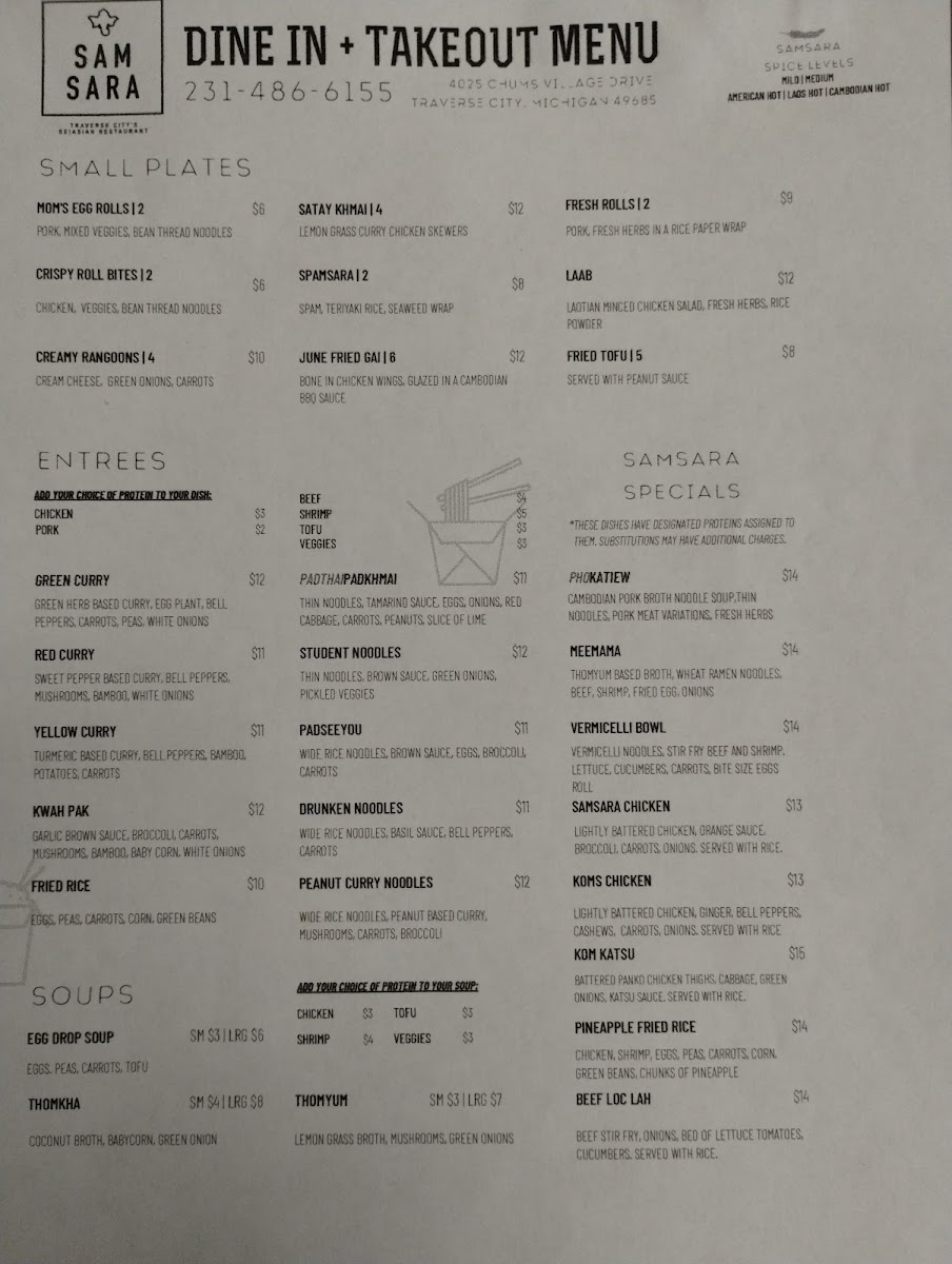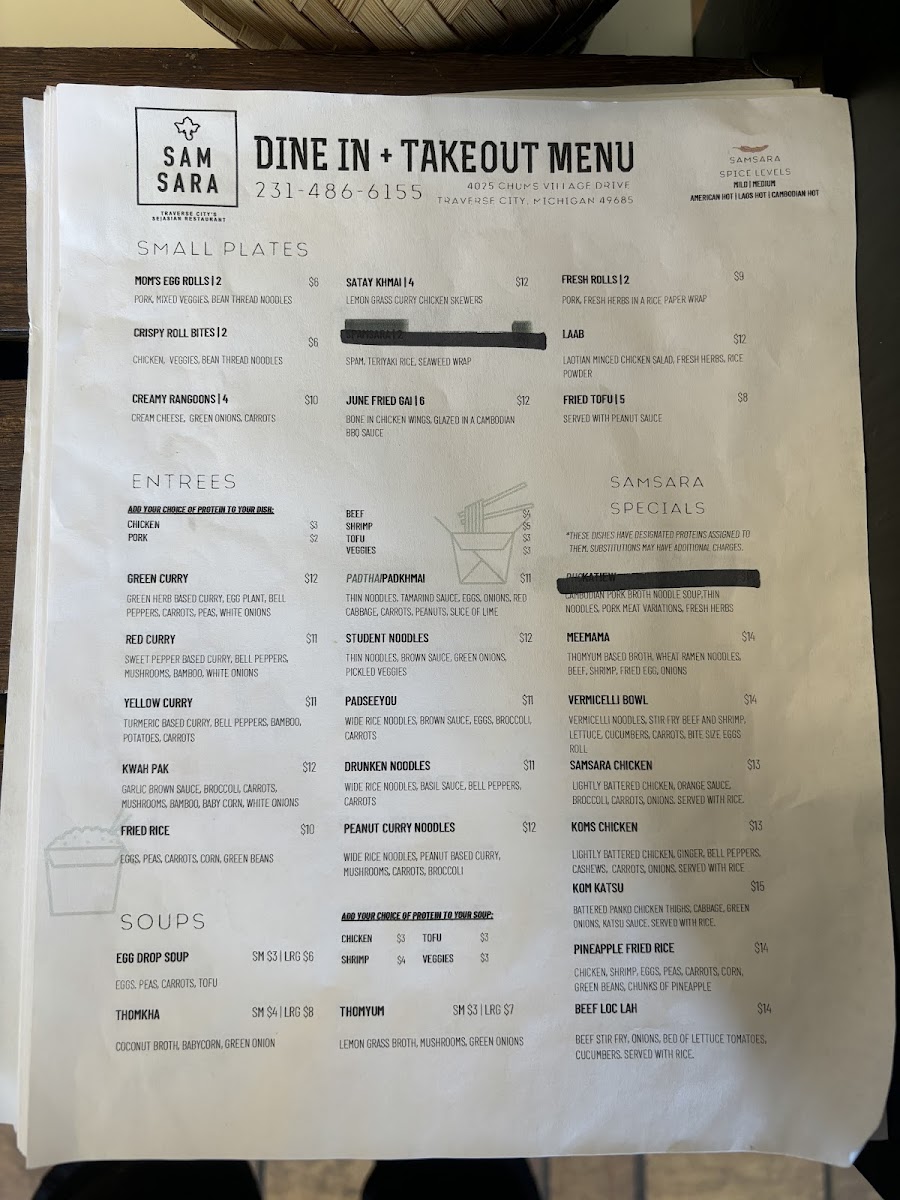Samsara Southeast Asian Cuisine brings the vibrant flavors of Thailand, Vietnam, and neighboring regions to Traverse City with a menu that celebrates balance, freshness, and aromatic spices. The restaurant offers a diverse selection of Southeast Asian favorites including noodle dishes, fragrant curries, rice plates, fresh salads, and savory appetizers. Guests can complement their meals with specialty teas, refreshing beverages, and traditional drinks that highlight the bright, herbal character of the cuisine.