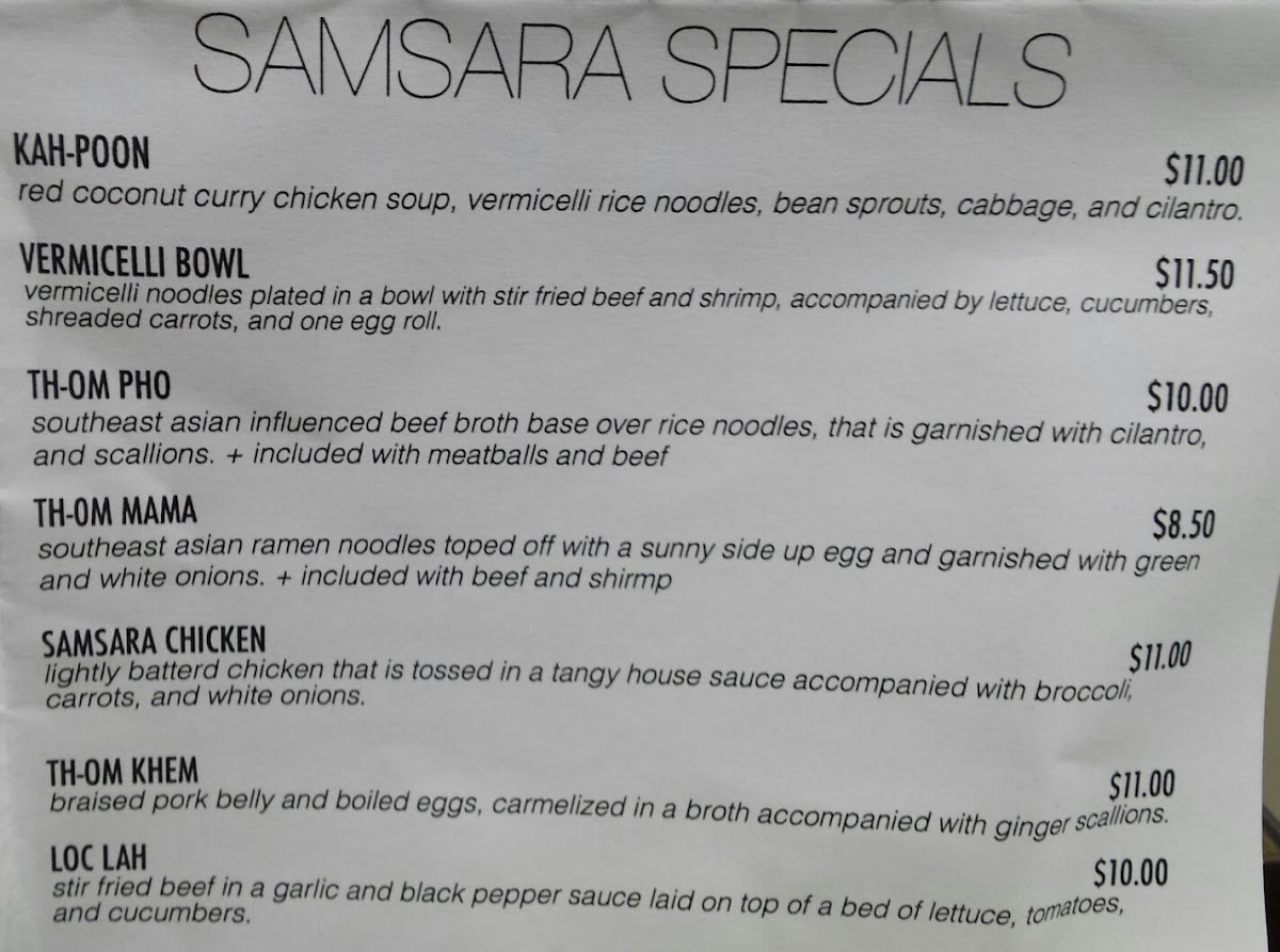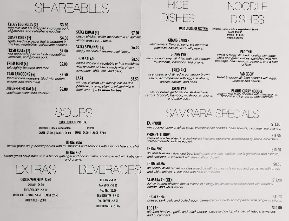 Vegetarian curries, tofu stir-fries, and vegetable noodle dishes provide plant-based options, while many rice and noodle dishes can be adapted for gluten-conscious diners. Mild spice levels and simple rice plates make the menu approachable for children. Ideal for casual lunches, cozy dinners, or shared meals with friends and family, Samsara Southeast Asian Cuisine offers a flavorful journey through Southeast Asia in a welcoming setting.